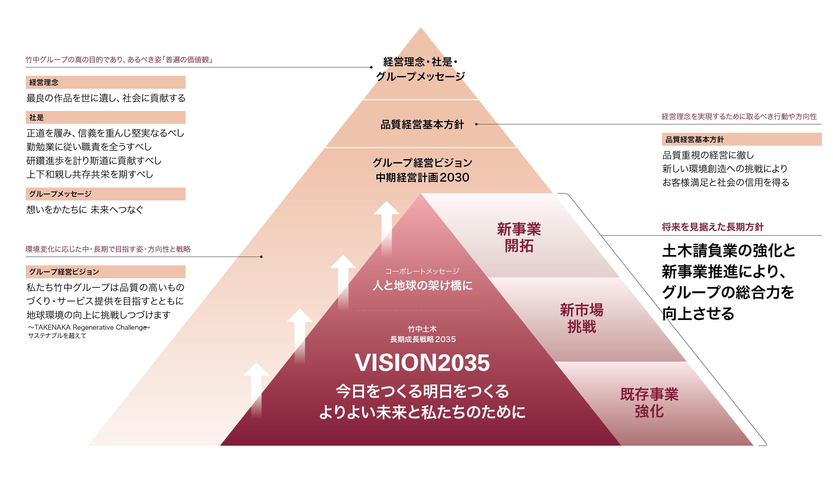 当社は竹中グループにおける土木事業の中核企業として、グループ経営ビジョンと、VISION2035「今日をつくる 明日をつくる よりよい未来と 私たちのために」の実現を目指しています。本体系図は、グループの普遍の価値観を礎に、中期経営計画を通じて、「既存事業強化」「新市場挑戦」「新事業開拓」の3つの基本方針を展開し、グループの総合力向上を図る考え方を体系化したものです。