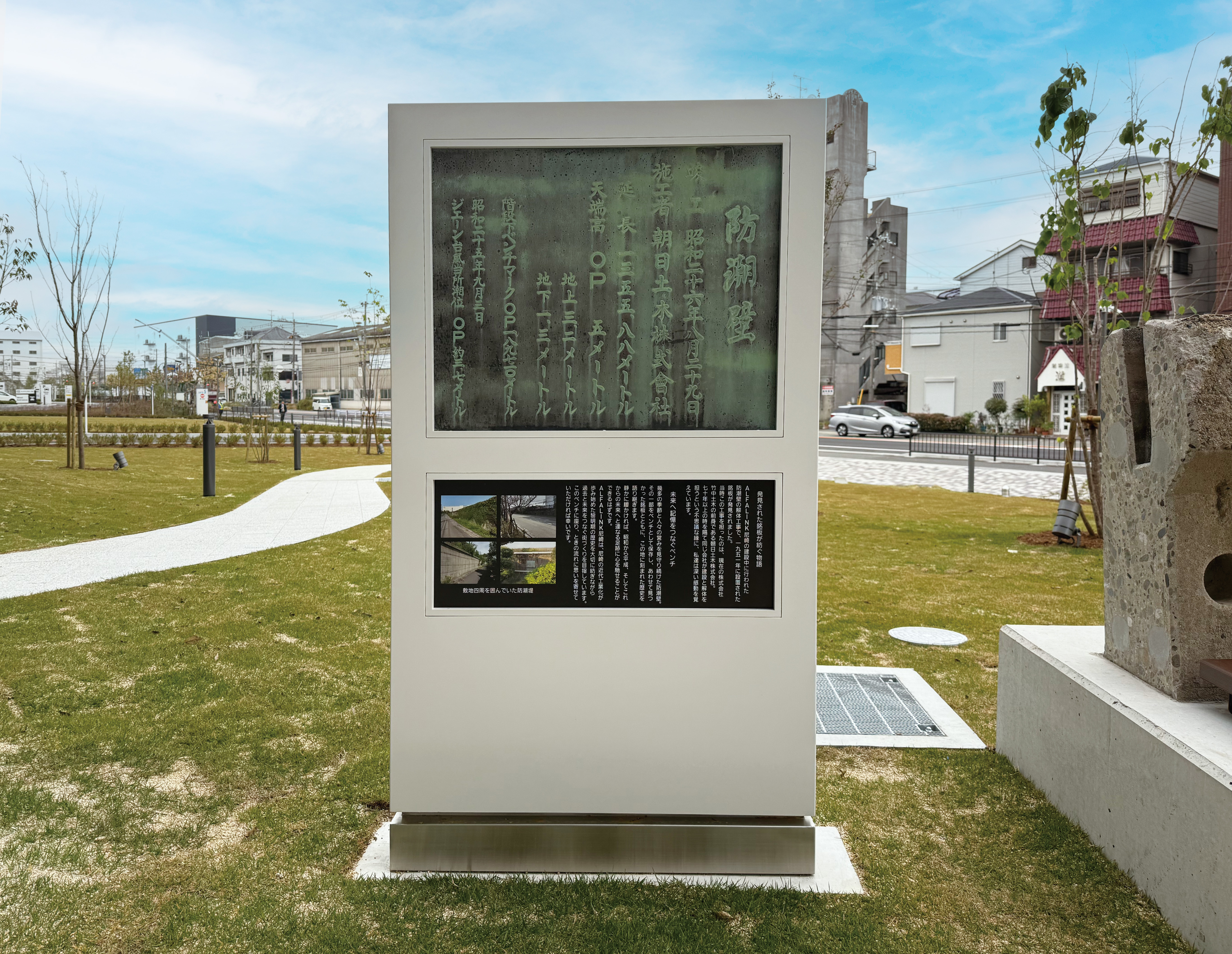 当社の前身である朝日土木株式会社が1951年にこの地に施工した防潮壁の銘板が、当該工事を開始した際発見されました。この防潮壁は、1950年9月に猛威を振るった「ジェーン台風」の教訓を基に築造されたものです。